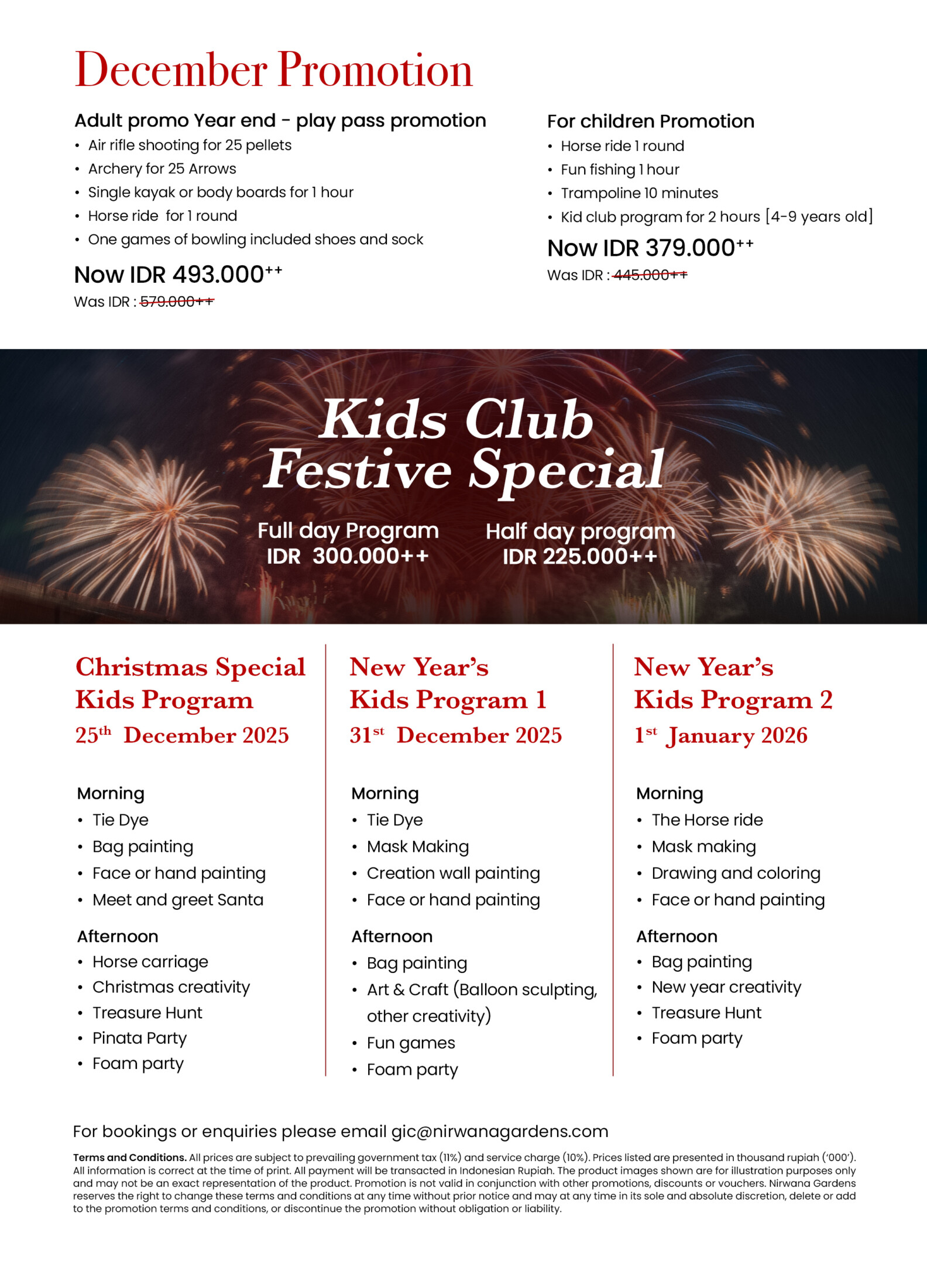 For enquiries or more information on our activities, email to gic@nirwanagardens.com or approach our Guest Information Centre at Nirwana Resort Hotel lobby. A complimentary resort shuttle is available for guests from the main resort lobby.