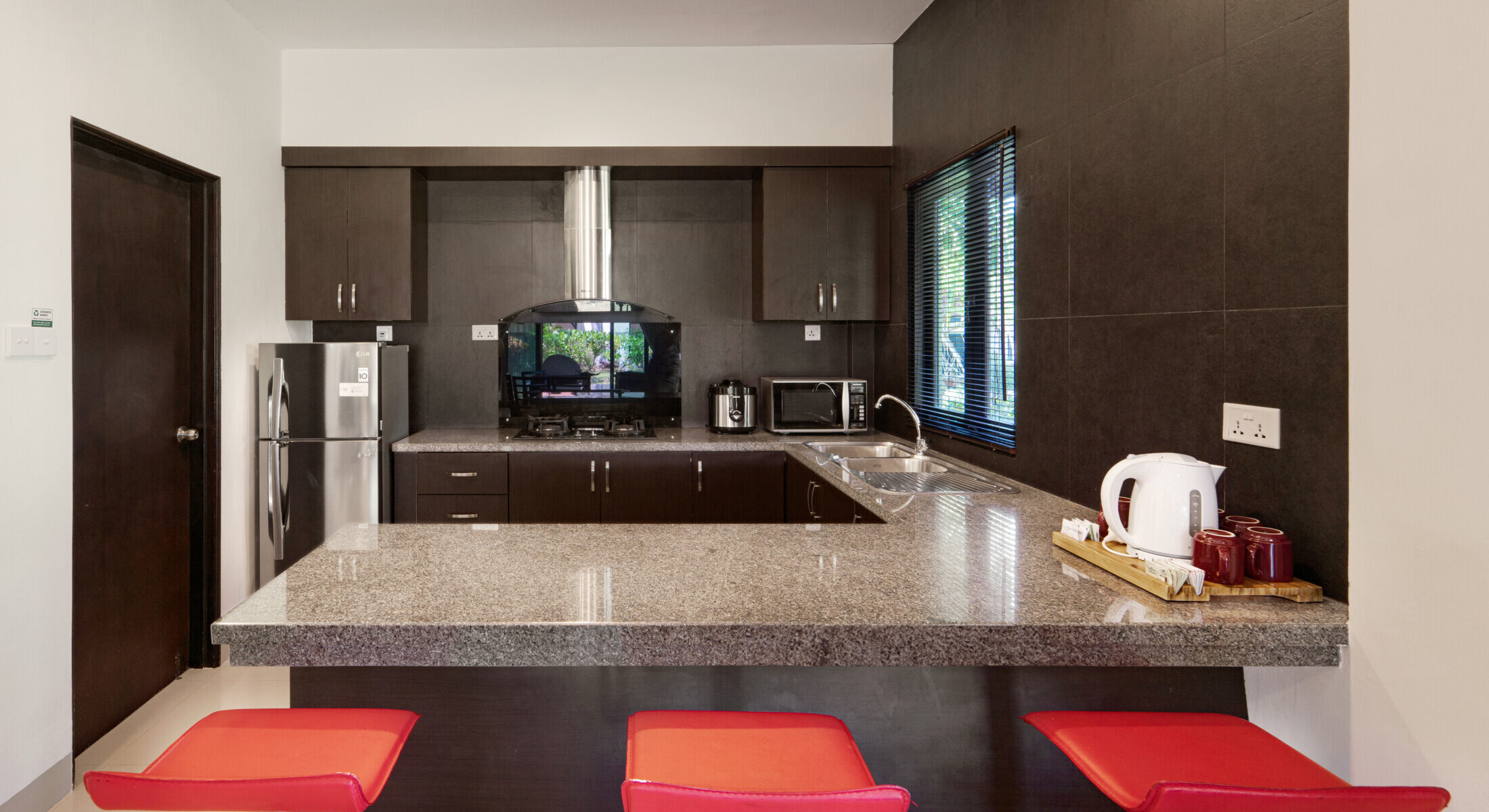 The fully equipped kitchen also includes a stove top, microwave oven, toaster, crockery and cutlery, providing our guests with the convenience and comfort of truly turning the Villa into a home.