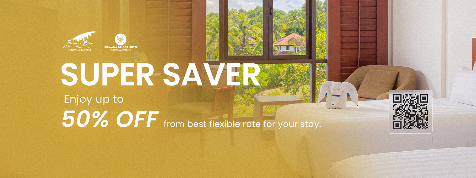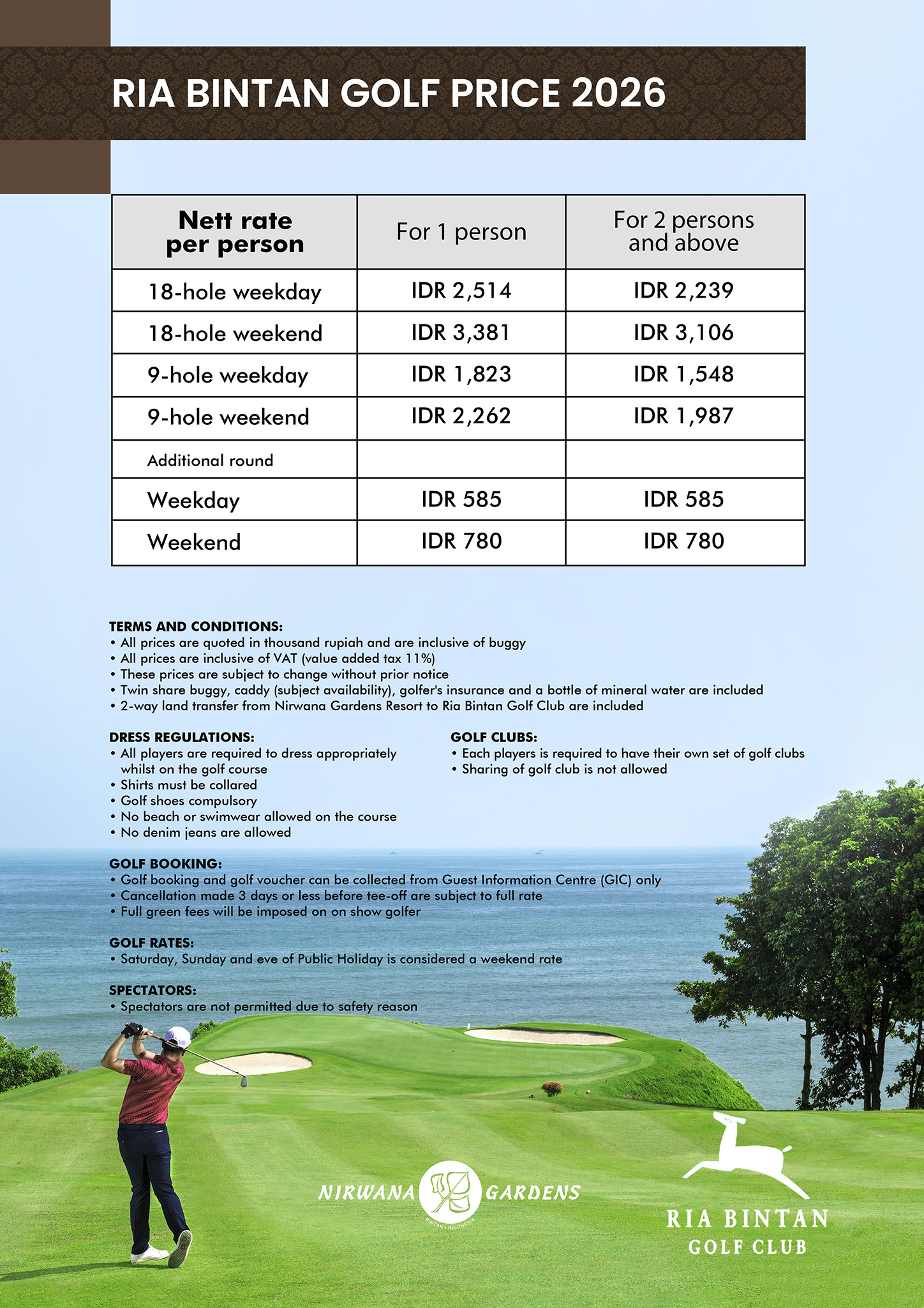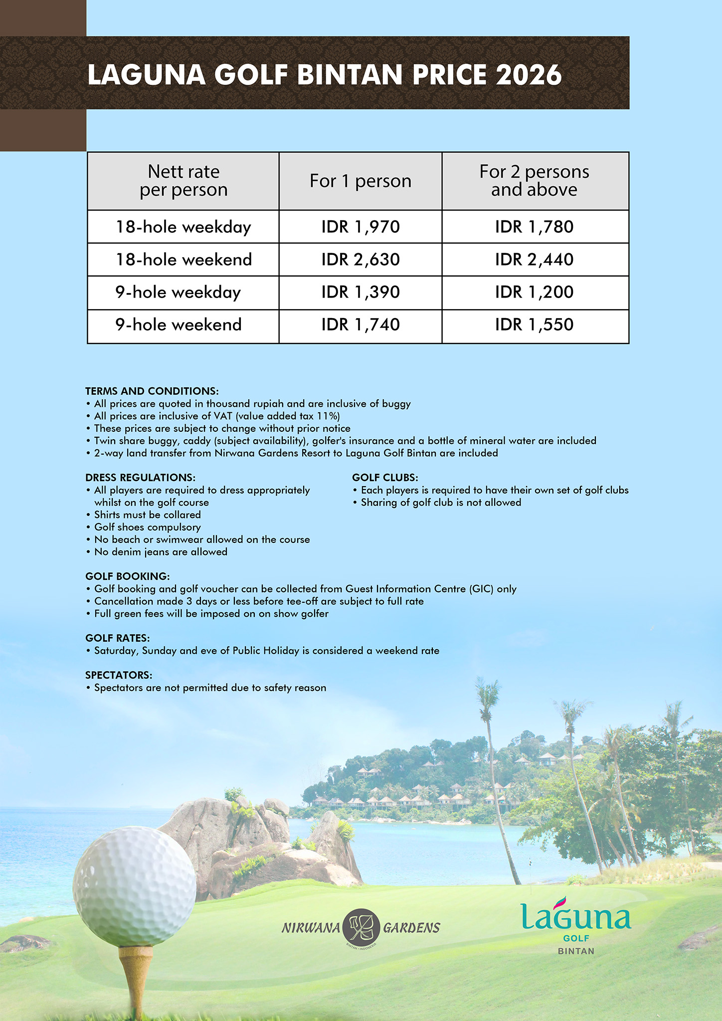 With 330 hectares of land, powdery beaches, and natural landscapes, Nirwana Gardens is a truly complete resort destination. Getting there is easy – via a 55-minute ride on high-speed catamaran from the Tanah Merah Ferry Terminal in Singapore, followed by either our free hotel shuttle bus or private transfer to the resort grounds. There’s an accommodation experience for everyone.