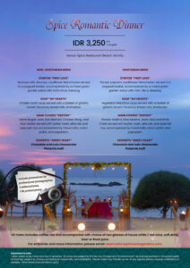 Under the sky filled with shimmering stars, we're having dinner that feels like dream, with the gentle night air and soft glow of candlelight setting the mood. Romantic dinner with view, food, and a person that making this moment feel like a timeless romance. Come and experience these feeling only with us at Spice Restaurant Beach Vicinity.