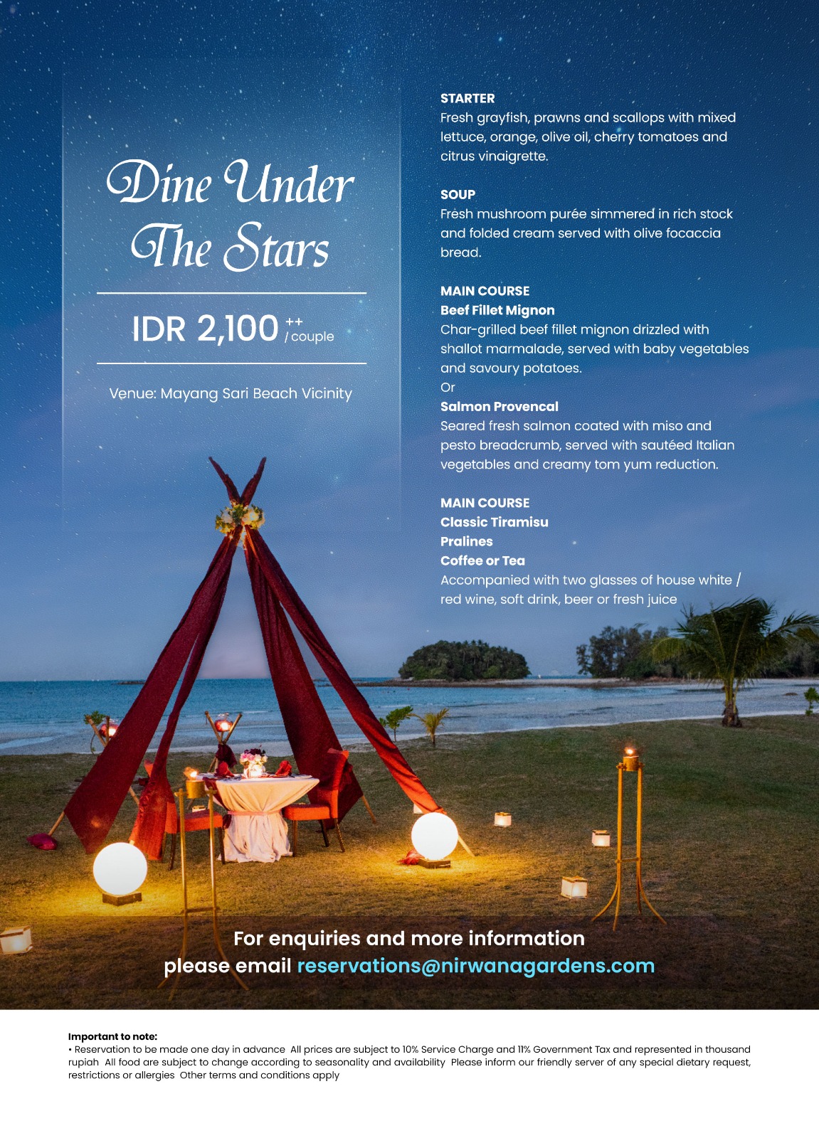 Email: reservations@nirwanagardens.com or Whatsapp: +62 811 691 8002 for enquiries.
