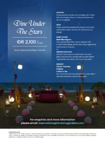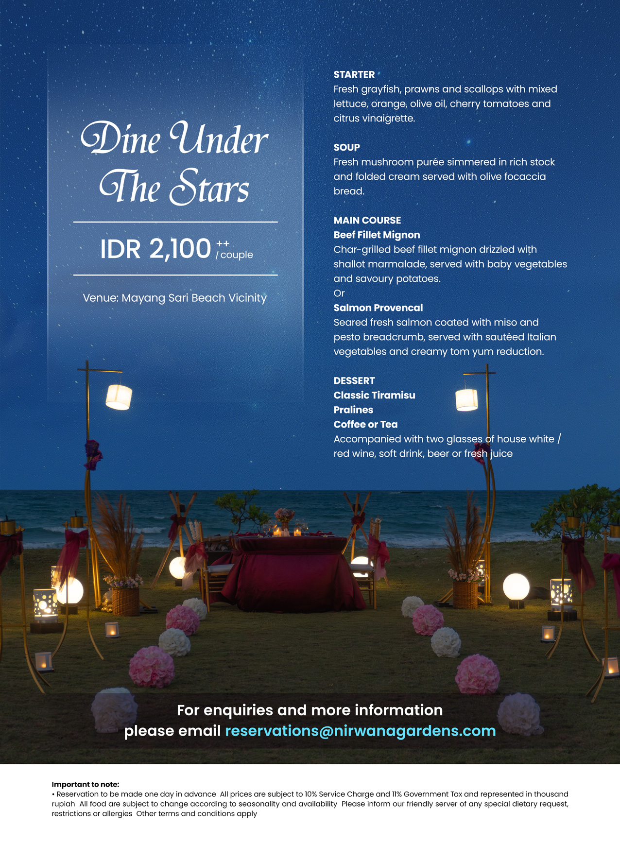 Email: reservations@nirwanagardens.com or Whatsapp: +62 811 691 8002 for enquiries.