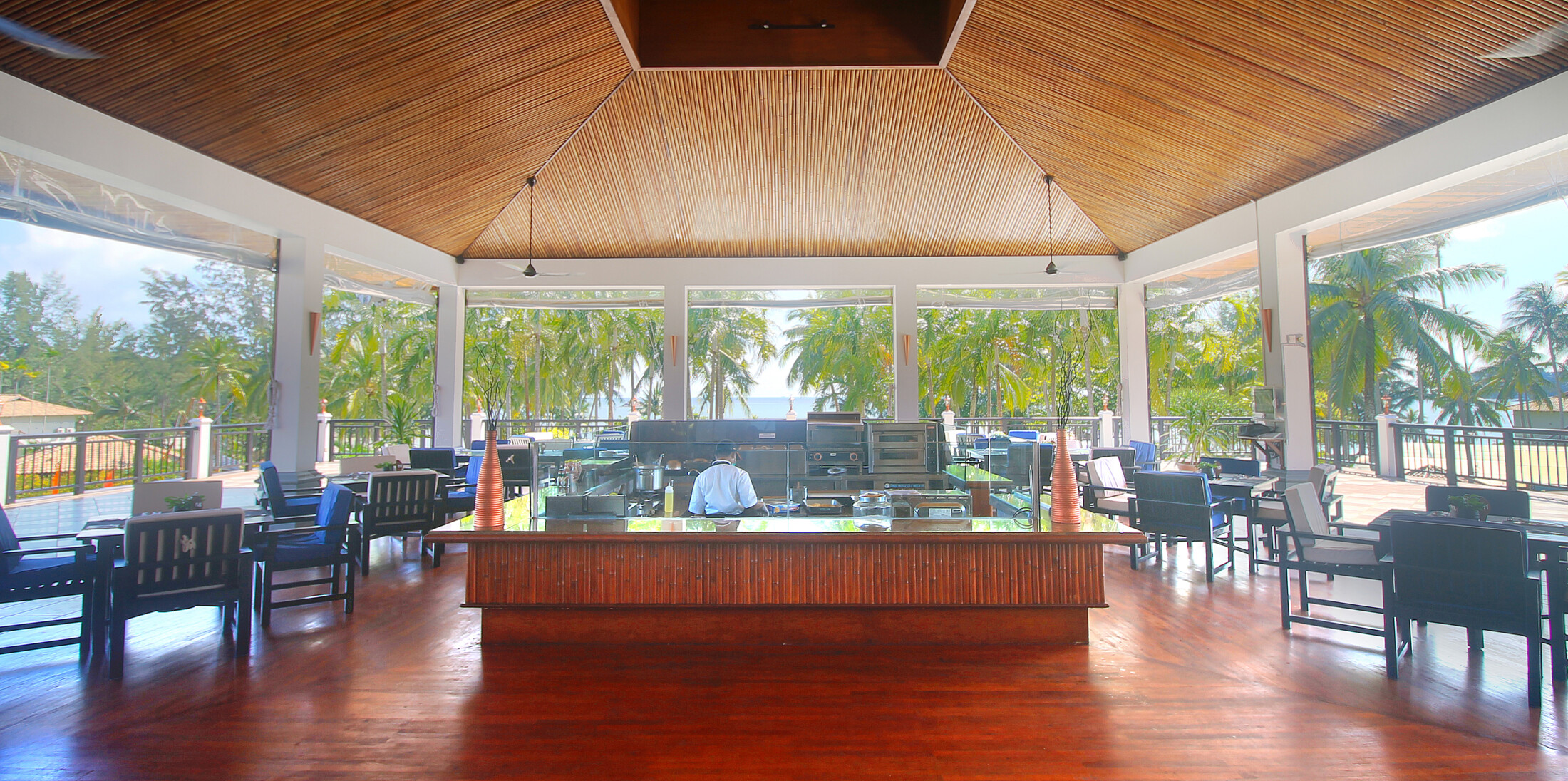Imagine a charming restaurant nestled on a private beach; where the gentle sound of waves breaking against the shore provides a soothing backdrop to your dining experience. As you step onto the outdoor patio, you're immediately captivated by the panoramic views of the azure ocean stretching out to the horizon. Your journey into the tastes of India begins with an authentic menu that showcases the rich tapestry of Indian flavours and spices conjured by our new Senior Chef from India, Chef Mohan.