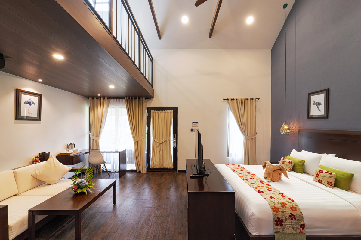 家庭阁楼不是传统的单层结构,而是 Mayang Sari 海滩度假村的首款复式木屋,能欣赏到花园或大海美景。它占地 53 平米,一楼设有 1 张大床,阁楼上设有 1 张单人床,可为带孩子的家庭提供舒适的现代生活空间。可以欣赏到海滩盛景的阳台、通透的玻璃落地窗、现代办公桌、简约内饰、360 度旋转液晶平板电视、创新花洒淋浴浴室、通用墙壁插头、多个 USB 端口,这套复式木屋适合每一位海滩爱好者休憩放松。