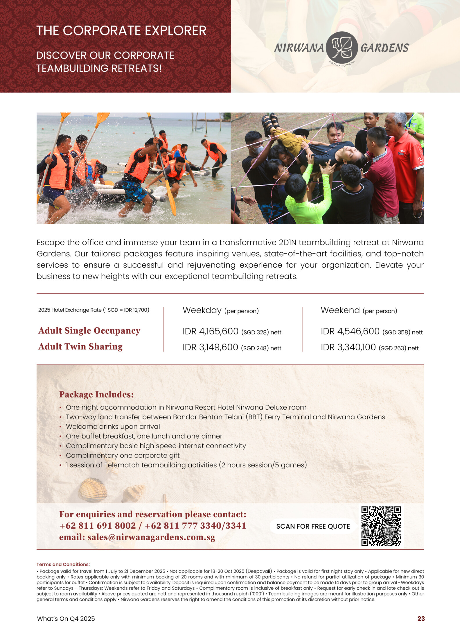 Nirwana Gardens 紧跟全球会展旅游业的发展步伐,时刻准备握紧商机,力求成为休闲和商务旅行领域的中流砥柱。Nirwana Gardens 共有 5 个活动场地,每一处都适合举办未来投资项目商讨会、公司会议和重要会议。 公司联谊会期间,还可以通过视听资源和综合户外培训设施提高团队和个人的技能。